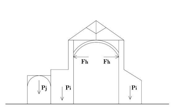 Il sub sistema, comunque individuato, si caratterizza per elementi relativamente snelli che consentono di proporre una modellazione ad aste-travi, riportando su di essi le spinte e gli scarichi degli archi e tenendo conto delle eccentricità d’assi, come già discusso in precedenza. Si tratta di sistemi isostatici o debolmente iperstatici a causa del possibile collegamento in testa dei piedritti.