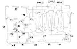 La copertura delle ampie aule deputate alle funzioni sociali sono realizzate o con strutture murarie curve (volte a crociera, a botte unghiate etc.) dotate o meno di catene o con capriate lignee spesso mascherate da cassettonati lignei. La modellazione strutturale deve tener conto del possibile effetto di incatenamento fornito da questi elementi ove siano ancorati alle pareti murarie. Anche in questo caso sembra consigliabile affidare ad eventuali vincoli interni (facilmente rimovibili dal modello) questo eventuale ancoraggio. Così pure per le catene c.d. lente (prive di pretensione) occorrerebbe tener conto della loro non immediata efficacia a trazione e della loro completa incapacità in compressione. L’impiego di elementi a resistenza unilaterale, spesso presenti nel software, trovano applicazione solo in analisi non lineari. Si consiglia quindi in questa fase sia di considerare che di trascurare la loro presenza.