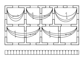 - Gli impalcati vanno modellati con una serie di puntoni; nel caso di volte, schematizzabili come due archi diagonali, si assume un puntone curvo, stabilizzato dall’altra diagonale. Tale assetto richiede che le fasce delle pareti funzionino come catene tensoresistenti. (rivedi Fig. 6).
