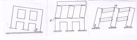 Notevoli incertezze affliggono la modellazione delle fasce che solo in presenza di cordoli e piattabande in c.a. assumono affidabile rigidezza flessionale (per la mancanza di significativo sforzo assiale) che si consiglia comunque di valutare orientativamente al 50% di quella corrispondente all’assetto geometrico. E’ evidente che lo schema spaziale complessivo prevede nelle cantonali e nelle croci di muro un doppio ritto appartenenti ciascuno ad una parete in una direzione (figura)