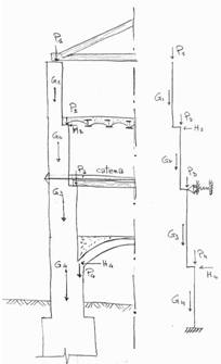 Solo nella terza l’impalcato può considerarsi (a meno di difetti e/o carenze nella realizzazione) come un affidabile diaframma rigido come nei moderni edifici intelaiati in c.a. Nelle altre due si possono prendere in considerazione nel piano orizzontale modelli ad arco ovvero a puntoni che possono conferire all’impalcato una capacità distributiva delle azioni orizzontali complessive tra le varie pareti ma questo solo in presenza di catene lungo le fasce murarie delle pareti o, in mancanza di esse, nei limiti della loro debole resistenza a trazione.